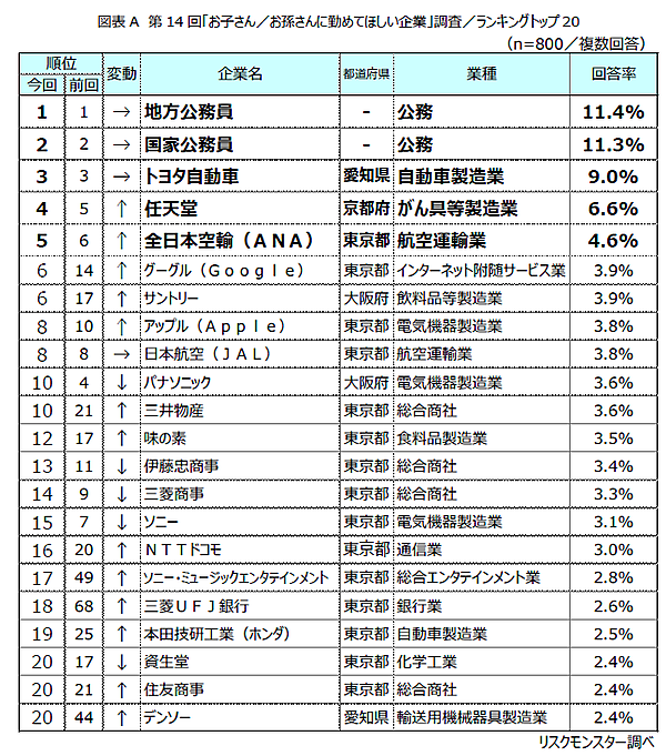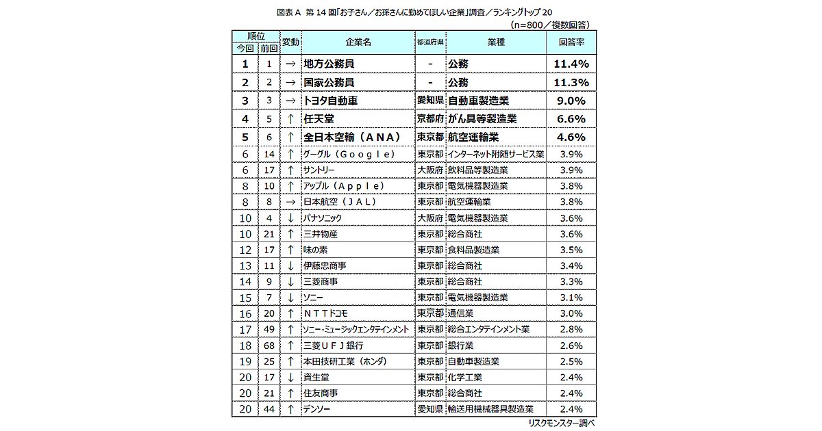 調査によると、子どもや孫に勤めてほしい企業の1位は「地方公務員」(11.4%)、2位は「国家公務員」(11.3%)となった。3位は「トヨタ自動車」(9.0%)、4位は「任天堂」(6.6%)、5位は「全日本空輸(ANA)」(4.6%)と続いている。