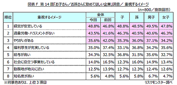 リスクモンスターは、「お子さん/お孫さんに勤めてほしい企業」に関する調査を実施した。全国の父母・祖父母800人を対象に、子ども・孫に就職してほしい企業や、企業選びで重視する点などを聞いている。 本調査は今回で14回目となる。