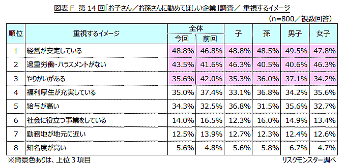 続いて、親が子どもや孫の勤務先において重視しているイメージを聞くと、1位「経営が安定している」(48.8%)、2位「過重労働・ハラスメントがない」(43.5%)、3位「やりがいがある」(35.6%)となった。事業が安定しており、肉体的にも精神的にも負担が少ない環境が求められているようだ。なお、5位の「給与が高い」(34.3%)は前回調査よりも増加しており、物価上昇の影響がうかがえた。