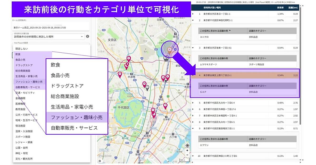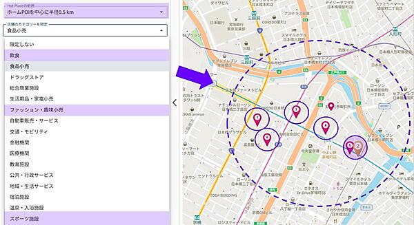 LAPはこれまで、自店舗や特定の場所の訪問者が他にどこへ行っているか可視化する機能「Hot Place(ホットプレイス)ランキング機能」を提供していた。今回、半径5km以内などの範囲で飲食、スポーツ施設など施設カテゴリ単位での分析を可能にした。競合分析、回遊傾向、関心分野を可視化し、ターゲットに合わせた広告訴求の設計や親和性の高い異業種との施策立案に活用できる。