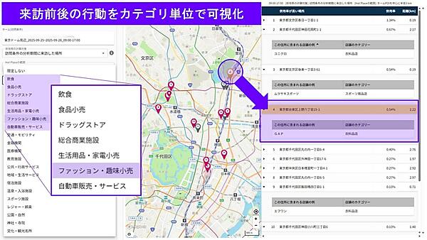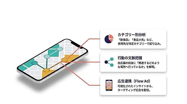 飲食、食品、小売り、ドラッグストアなどの施設カテゴリ単位で把握できる。特定の場所に来訪した、という従来の“点”での捉え方だけでなく、来訪前後にどの施設カテゴリを併用しているかといった行動に基づいた分析が可能。潜在的な興味・関心を可視化して広告配信に生かすことで、自店舗の来訪者に加えて関連性の高い行動傾向がある層に向けてアプローチできるようになる。