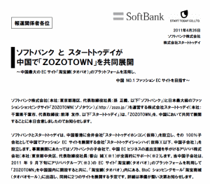 ・ ソフトバンクとスタートトゥデイが中国で「ZOZOTOWN」を共同展開(プレスリリース)