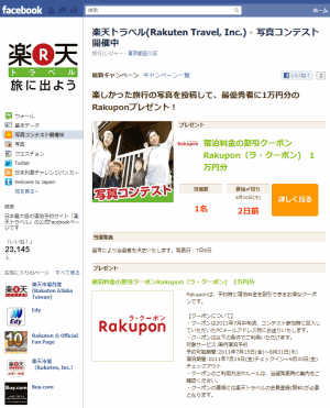 楽天トラベルは「楽しかった旅行の写真」をテーマにしたフォトコンテストキャンペーンを同日から始めた。利用者は楽天トラベルファンページのファンになると、クリックなどの簡単な作業だけで画像をファンページ内に投稿できる。画像はページ内にアップされ、さまざまなユーザーの作品と一緒に表示される。