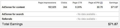 その1つは、Adsenseが実のところ、Google Analyticsよりも多くのインプレッション数を報告していたということ。僕らが見たGoogle Analyticsのデータは、10万199ページビューだったのに、AdSenseではインプレッション数が10万2029回となっていたんだ。僕らが4日間で稼いだ手数料は、合計で71.87ドルだった。また、掲載広告はかなり高度にターゲティングされていたようだったけど、平均クリックスルー率は0.24%という惨憺たるものだった。