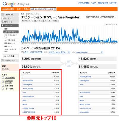 ストライカー役の資料請求や店舗一覧のページを対象にして、そのページへの動線を調べよう。この機能はほとんどのアクセス解析ツールに搭載されている。たとえばGoogle Analyticsなら、[コンテンツ]>[上位のコンテンツ]の表からストライカーページを選んでURLをクリックすれば、そのページの詳細データが表示される。その「ナビゲーションの分析」の中に[ナビゲーションサマリー]というリンクがあるからクリックしてみよう。そのURLの参照元トップ10が表示される。これが、センタリングを出すアシスト役となるページトップ10ということになる(図4)。