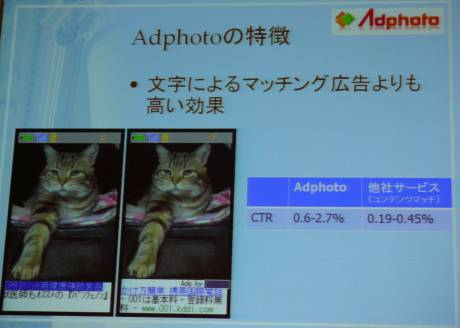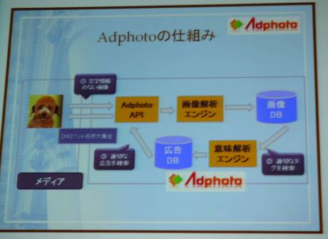特に、新興企業が新たな事業アイデアをほんの数分で次々にプレゼンテーションしていく「ランチパッド」では、ジェイマジックが画像連動型広告プラットフォーム「Adphoto」で注目を集め、審査委員から1位に選ばれた。同社は、ケータイで写真を撮って送信すると、誰に似ているか判断してくれるサービス「顔ちぇき」で知られる。今回初公開した「Adphoto」は、脱キーワード検索を狙い画像のマッチングを活用した広告配信サービスだ。