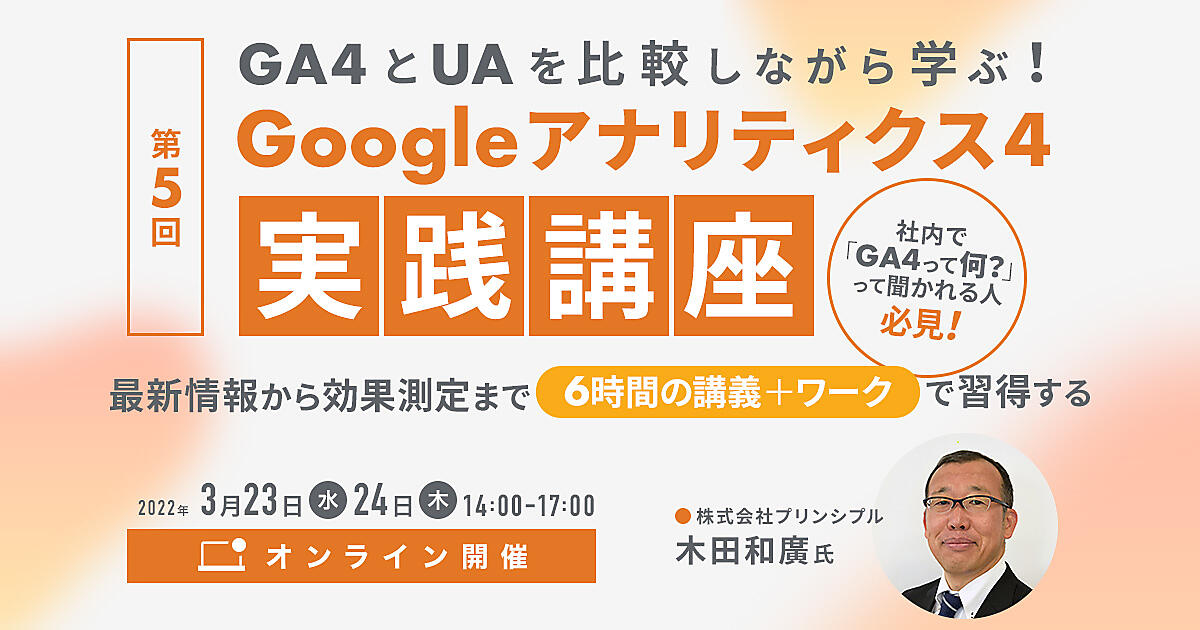 | セミナー名 | GA4とUAを比較しながら学ぶ! Googleアナリティクス4 実践講座 〜社内で「GA4って何?」って聞かれる人必見! 最新情報から効果測定まで6時間の講義+ワークで習得する〜 |