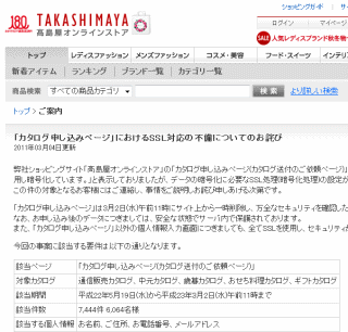高島屋(本社大阪市)は3月4日、運営するECサイトの「カタログ申し込みページ」にセキュリティ対応の不備があったと発表した。