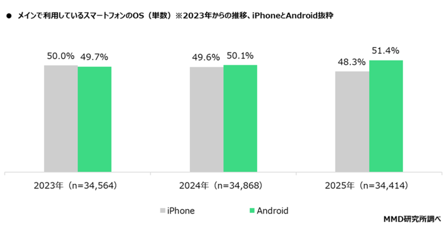 AndroidがiPhoneをシェア逆転! Androidユーザーの人気機種は「AQUOS」【MMD研究所調べ】 若者はiPhone派、シニアはAndroid派! 利用しているスマホキャリアによっても違いあり。