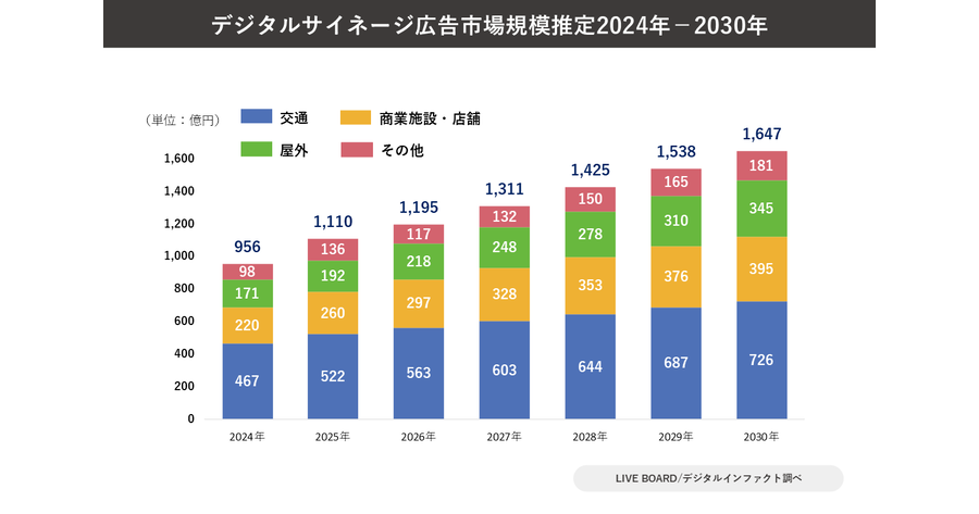 デジタルサイネージ広告、2030年には1,600億円超規模へ。屋外ビジョンが牽引か【デジタルインファクト/LIVE BOARD調べ】 「動く広告」が街を席巻? デジタルサイネージ、大手コンビニも全国1万店舗に導入。