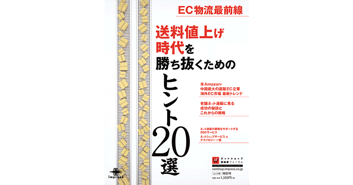 送料値上げ時代に対して、「物流のプロ10人が物流コスト見直しにどう取り組むべきか」「EC事業者の具体的な取り組み」といったことを20選としてまとめています。その他、止まらないアマゾンの成長にどう向き合うべきかや成長著しい中国EC市場のレポートも掲載。アマゾン、ヤフー、楽天の三大モールに聞くネット通販の今と昔など盛りだくさんの1冊です。