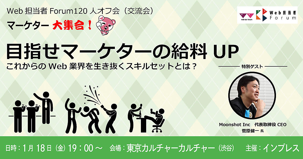 Web担当者Forumでは、マーケターに必要なスキルセット&給料アップのためのセミナーとオフ会(交流会)を2019年1月18日(金)渋谷で19:00から開催します。120人限定です。もちろんマーケター以外の方も大歓迎! 「Webマーケターに興味あるから話してみたい」「ちょっとお話聞いてみたい」でも参加はOKです!