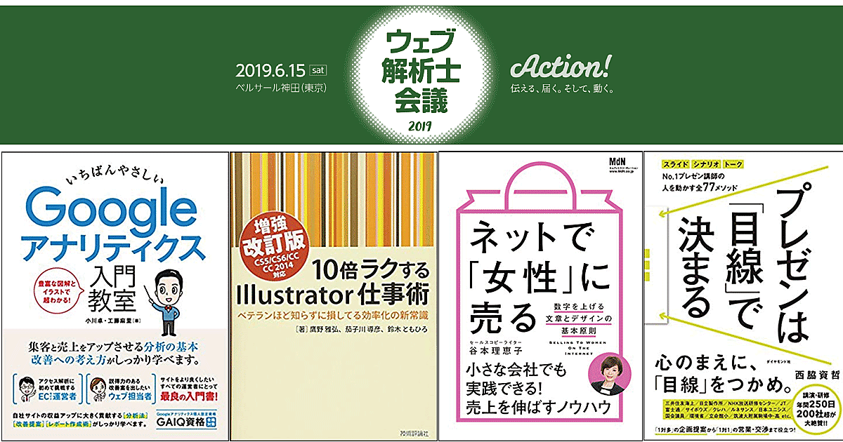 プレゼント本の紹介の後には、これらの書籍の筆者である、鷹野雅弘氏、小川卓氏、谷本理恵子氏、西脇資哲氏らに加えて、平岡謙一氏(アクシス)、枌谷力氏(ベイジ)が登壇する「ウェブ解析士会議2019「Action! ~ 伝える、届く。そして、動く。」」セミナー6/15(土)@神田も紹介しています。そちらも要チェックです。