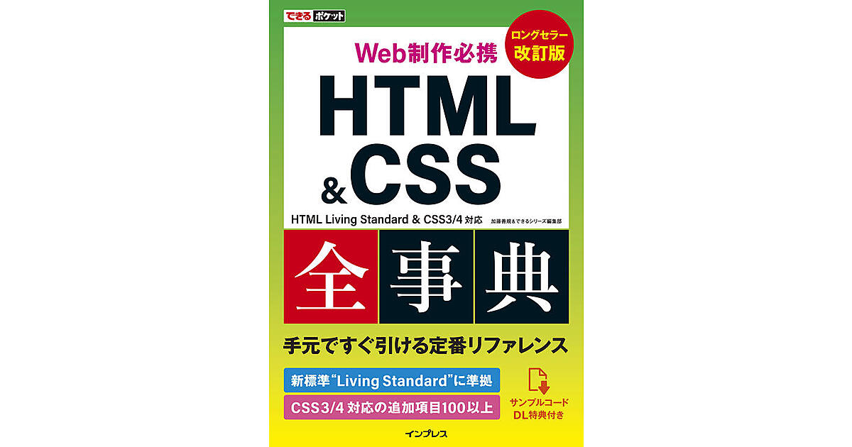 本書は、HTML Living Standardの仕様に準拠した要素(タグ)と、主要なブラウザーで動作するCSS3およびCSS4のプロパティをすべて掲載しています。