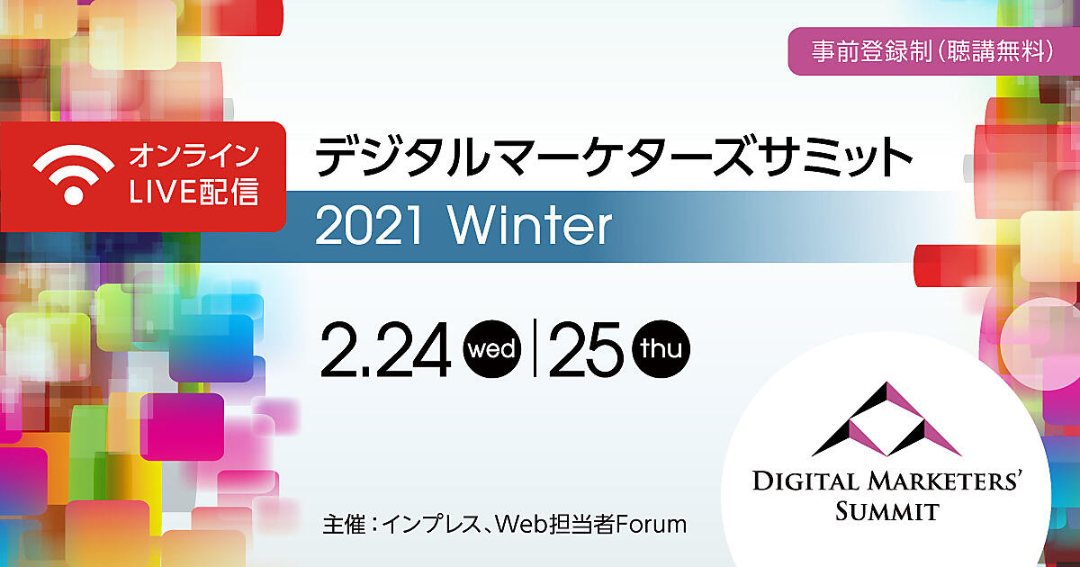 Web担当者Forum主催、広告主参加限定のオンラインセミナー「デジタルマーケターズサミット 2021 Winter」が2/24-25で開催が決定しました。全2日間、2トラック・全24講演(予定)でオンラインイベントを開催します。