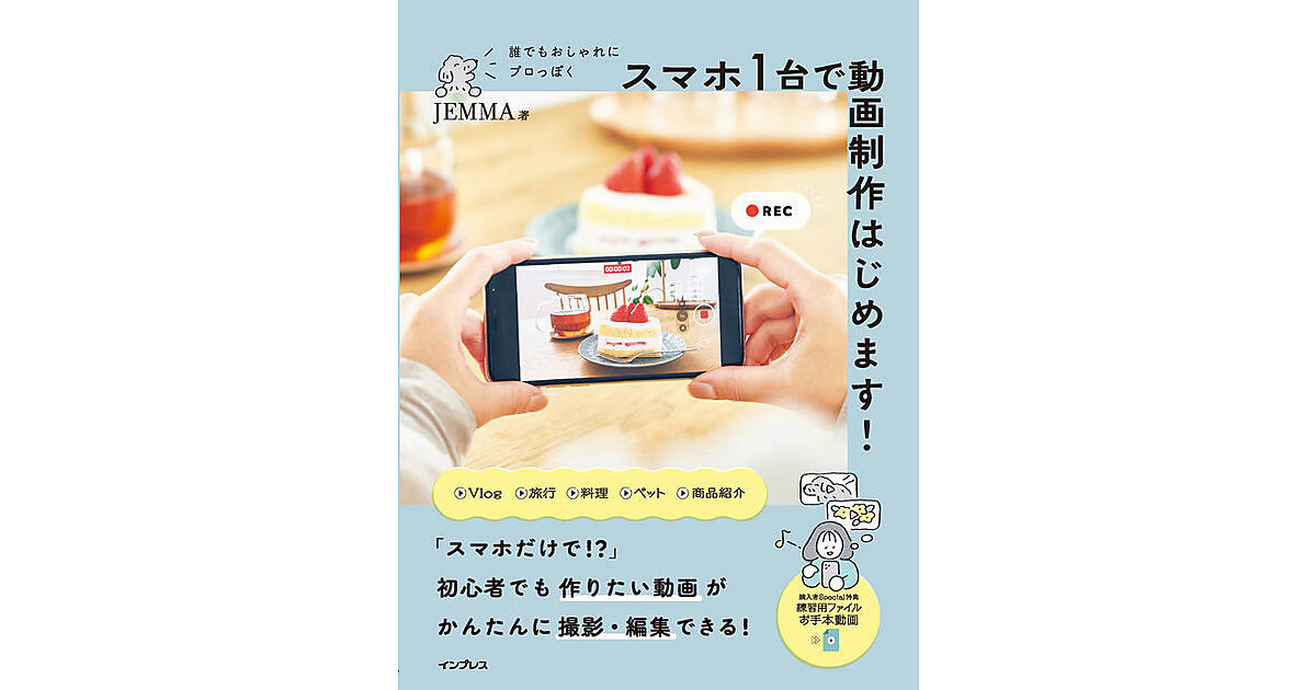 本書ではスマホ1台でできる、動画制作のテクニックを紹介。押さえておきたい基本のコツから上級者向けの演出テクニックはもちろん、旅行・暮らし・ペットなどジャンル別の動画レシピも解説しています。