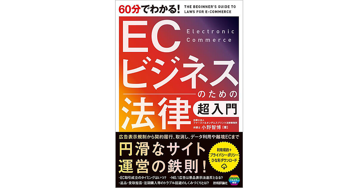 広告表示規制から契約履行、取り消し、データ利用や越境ECまで網羅しています。また巻末付録として、ECサイト向け「利用規約」+「プライバシーポリシー」のひな形をダウンロードできます。