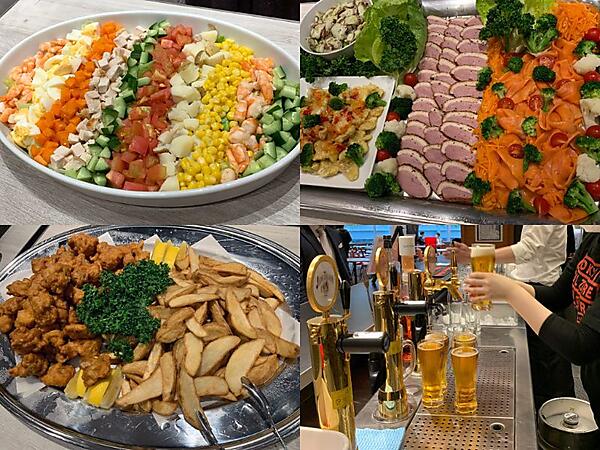 サラダやオードブル盛り合わせ、ポテトなど全6品のフードをご用意します。飲み放題には生ビールやハイボール、レモンサワー、ワインなど。もちろんソフトドリンクもあります!