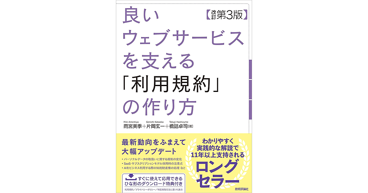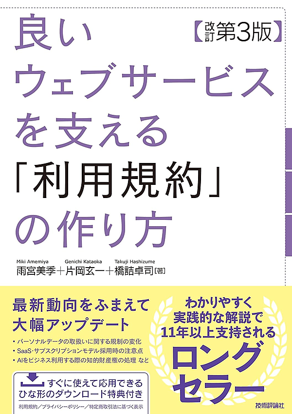 利用規約本のベストセラーが、「パーソナルデータの取扱いに関する規制の変化」「AIをビジネス利用する際に気をつけるべき知的財産権の処理」「サブスクリプション・SaaSモデルへの対応」などの最新動向をふまえ、約50ページのボリュームアップで大幅リニューアルしました。