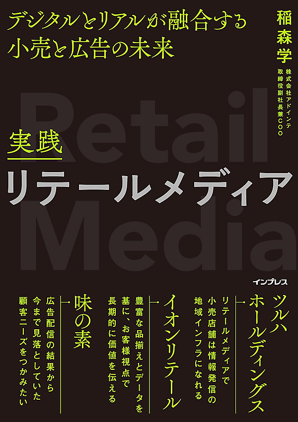 本書では、アドインテ副社長・稲森氏が、リテールメディアの基本概念をあらためて解説。小売企業とメーカーの最新事例を紐解きながら、データ基盤の準備や、購買データの代表的な分析手法、よくある失敗と対策まで網羅し、リテールメディアの「実践」に向けた取り組みを紹介します。