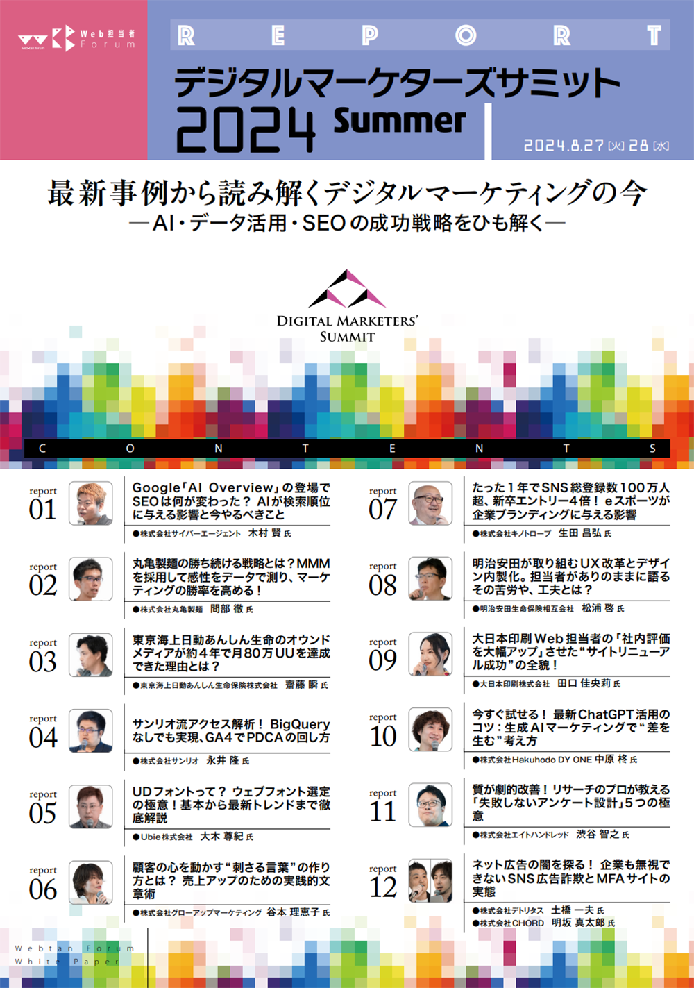 今回は、2024年8月27日、28日にWeb担当者Forumが開催した「デジタルマーケターズサミット 2024 Summer」から、マーケティング業界の最新動向がわかる12本の講演レポート(全117 ページ)を用意した。