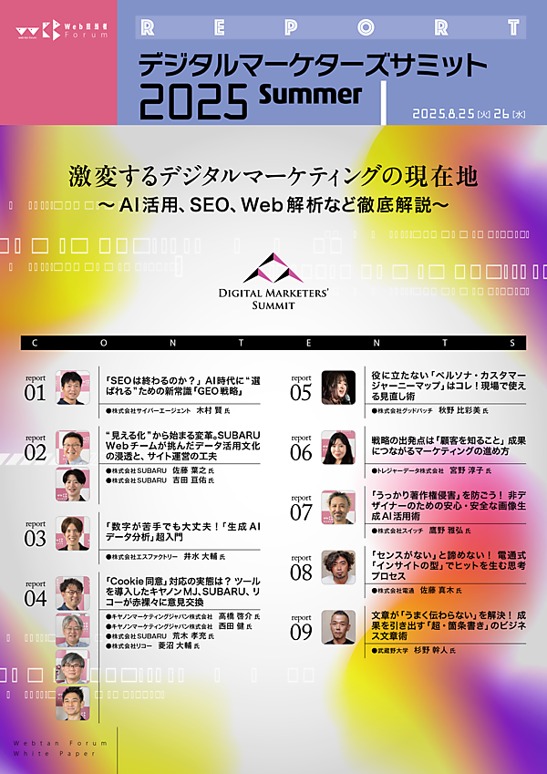 今回は、2025年8月26日にWeb担当者Forumが開催した「デジタルマーケターズサミット 2025 Summer」から、マーケティング業界の最新動向がわかる9本の講演レポート(全86ページ)を用意した。