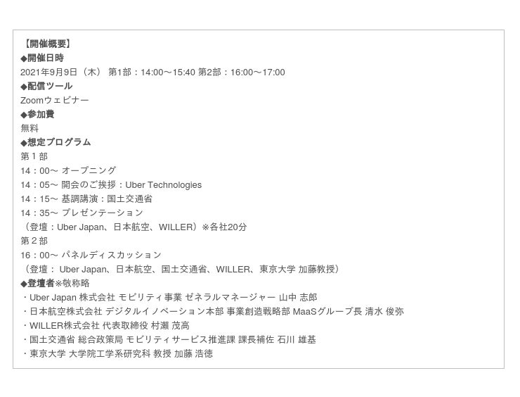 この度、Uber Japan株式会社はオンラインカンファレンス「MaaSが変えるモビリティの未来」を、2021年9月9日(木)に開催します。