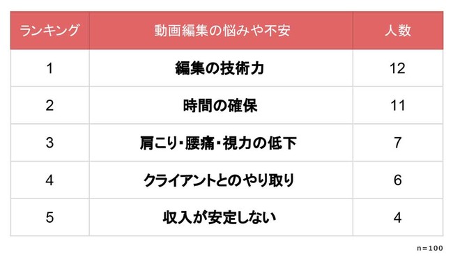 動画編集の副業で悩みや不安は「編集の技術力」が1位