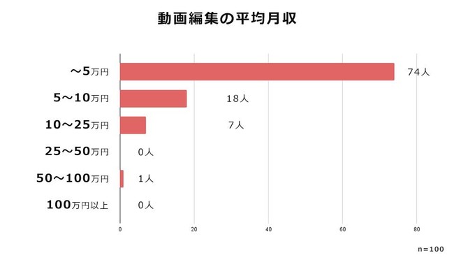 100人にアンケートを行ったところ、「平均月収5万円未満」と回答したのは、74人でした。一方で「4人に1人が、5万円以上稼げている」という回答でした。