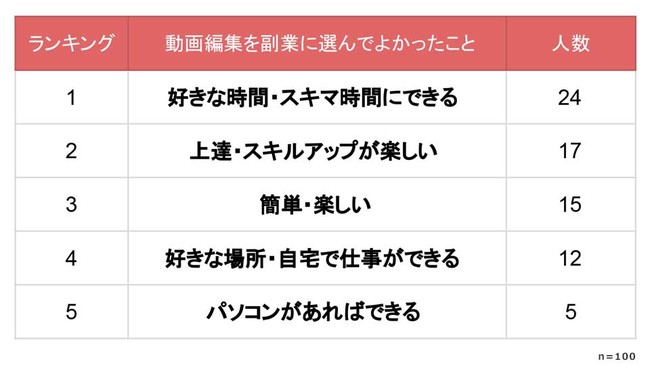 動画編集を副業に選んで良かったことは「好きな時間・スキマ時間にできる」が1位