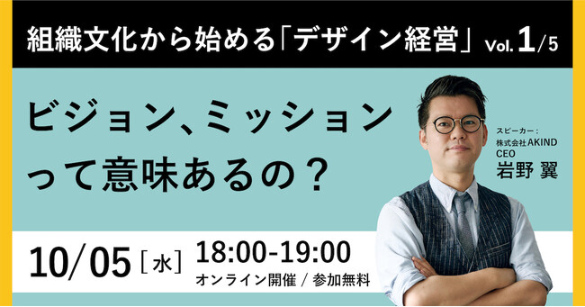 最近よく耳にする「デザイン経営」という言葉。「でも、具体的に何から取り組めばいいの?」という疑問をお持ちの方も多いのではないでしょうか。本セミナーでは、【組織文化から始める「デザイン経営」Vol.1(基本編)】と称して、これまで数多くのブランディングに携わってきた株式会社AKINDの代表 岩野 翼が、全5回にわたって解説します。初回のセミナーでは、”ビジョン、ミッションって意味あるの?”を副題に掲げ、皆様の会社、組織が掲げている方針について、デザイン経営との接点についてお話しします。