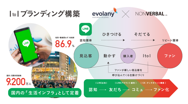 国内利用者9200万人の圧倒的な普及率とコミュニケーションツールとして高い完成度を誇るLINEを活用することでBtoC、BtoBに関わらず、1to1コミュニケーションを実現することが可能です。エボラニ社と提携する事で、LINEが提供するAPIを連携させ、自由にカスタマイズし、独自のサービス体制をデザイン構築することが可能となり、今後弊社サービスの強みの一つになります。