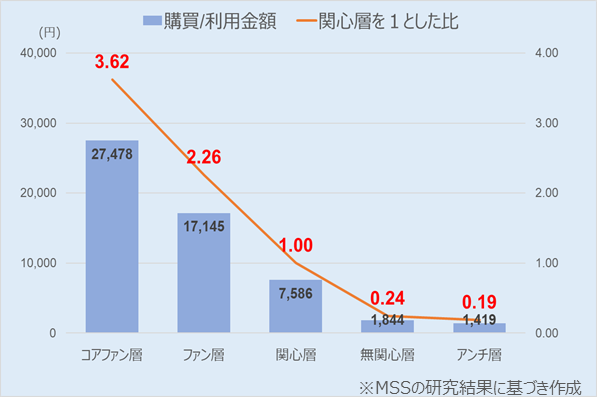 このたびのMSSの研究結果によると、「FRS」は、従来のロイヤリティ指標の代表である「推奨意向」などと比べても、ブランドやサービスの物質的な価値(=直近の購買・利用金額)との相関係数が高い傾向があり、「FPS」のスコアに基づくコアなファン層の購買・利用金額は、単なる関心層の3.62倍にもなりました。また、本研究結果として、性年代別、業種別の基準値も蓄積しており、これらの基準値との比較データの提供も可能です。