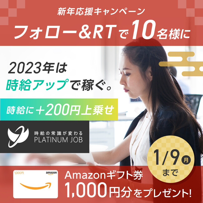 株式会社NOWWORKが運営する求人サイト【プラチナジョブ】が新年応援キャンペーンとしてAmazonギフト券1,000円分を10名様にプレゼント!【応募〆切 1月9日まで】