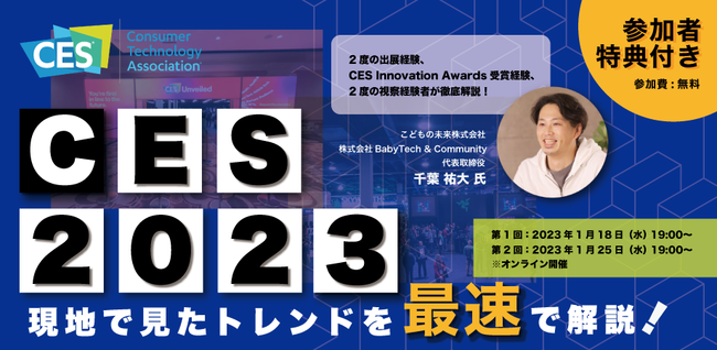 こどもの未来は地球の未来、こどもの未来株式会社(本社:東京都世田谷区、代表取締役会長:千葉 祐大)は、2023年1月5日から開催された世界最大のTechイベント、CES 2023のトレンド解説の無料ウェビナー、「★参加者特典あり★CES2023 現地で見たトレンドを最速で解説!」を2023年1月18日(水)、2023年1月25日(水)に開催します。