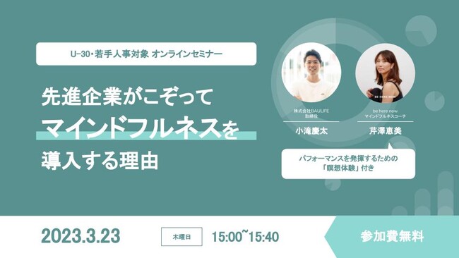 株式会社BAULIFE(代表:高橋香輝)は、2023年3月23日(木)にオンラインにて、「先進企業がこぞってマインドフルネスを導入する理由」オンライン無料セミナーを開催致します。このセミナーは、先進企業がこぞってマインドフルネスをビジネスに導入した理由とその効果を紐解き、セッションを通じて自分自身も体験できる人事向けイベントです。セミナーの後半にあるセッションでは、法人向けにマインドフルネス研修を提供するBE HERE NOW(代表:芹澤恵美)による「パフォーマンスを発揮するための瞑想」を実際に体験して頂きます。オンライン開催で参加費無料、当日の参加も可能です。