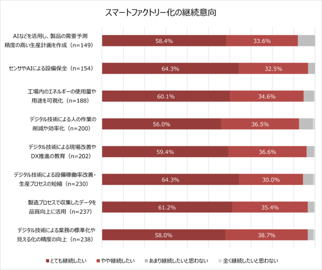 スマートファクトリー化に関する現在の取り組みについて、今後も継続したいと回答した方がすべての項目で9割を超える結果となりました。