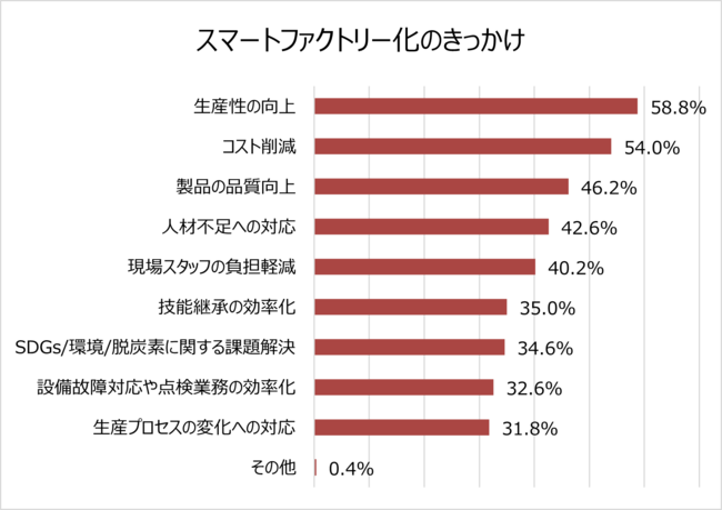 実際に自社のスマートファクトリー化に携わる500名に対し、スマートファクトリー化のきっかけをお聞きすると、設備稼働率改善・生産プロセス短縮・生産計画の精度向上などの「生産性の向上」が58.8%と最も多く、次いで、「コスト削減」が54.0%と続きました。