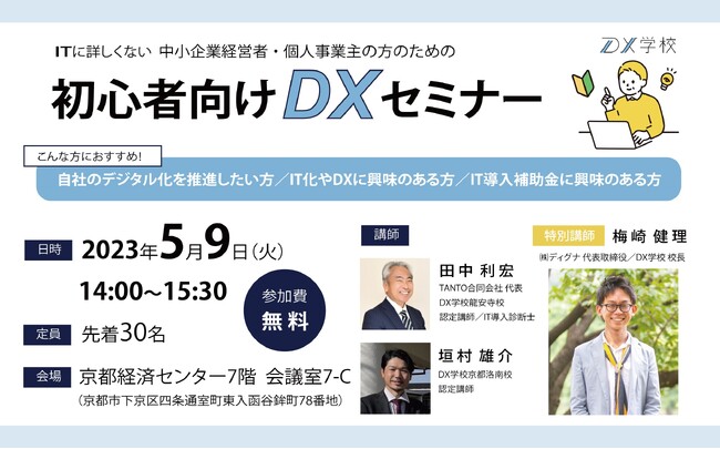 全国の企業へのIT導入支援を行っているDX学校より、龍安寺校(TANTO合同会社、本社:京都市右京区、代表:田中利宏)と京都洛南校(講師:垣村雄介)は、株式会社ディグナ(本社:東京都港区、代表取締役CEO:梅崎健理)と合同で「ITに詳しくない中小企業経営者・個人事業主の方のための初心者向けDXセミナー」を5月9日(火)に京都経済センターにて開催いたします。参加費無料、現在参加申込受付中です。