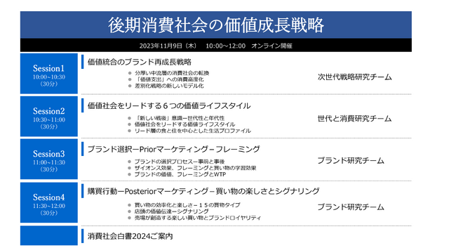 いまの時代をどう捉え、市場をどう読むか、どんな戦略展開が必要か、時代の半歩先を読む消費社会白書2024のエッセンスをいちはやくお届けするネクスト戦略ワークショップを11月9日に開催することになりましたのでご案内いたします。多くの方にご視聴いただくために、今年もオンラインでの開催とさせていただきました。