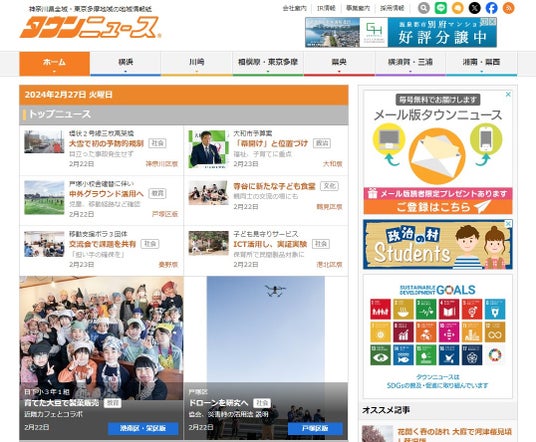 地域情報紙タウンニュースの記事が集約されたWebサイトです。月間平均閲覧数は約280万、月間平均ユニークユーザー数は約150万となっています。Webオリジナル記事も掲載し、イベント情報、地域のユニークなお店情報、地産地消グルメ情報など、地域住民の生活に役立つ情報を満載しています。Web独自の広告掲載も可能で、地域企業の販促活動にも効果的です。