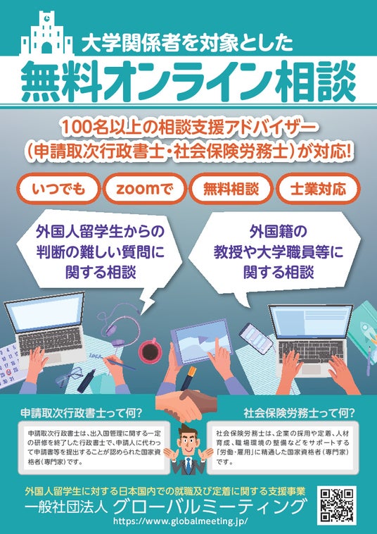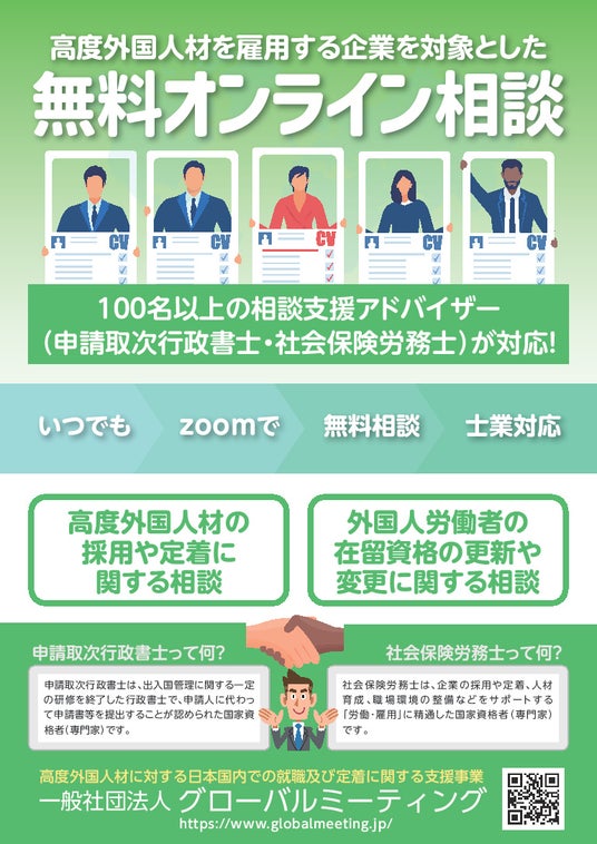 一般社団法人グローバルミーティング(事務局:東京都)は、「高度外国人材に対する日本国内での就職及び定着に関する支援事業」の一環として、4月1日(令和6年度)から「高度外国人材を雇用する日本全国の企業」を対象とした無料オンライン相談を開始いたします。