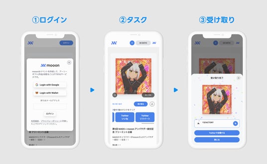 【販売時期】2月下旬~ ※独自のオンラインストアにて販売【販売価格】2月中旬頃発表■mooonについてmooonは、世界中の全てのユーザーが手軽にNFT配布を通したNFTマーケティングを行うことができるグローバルプラットフォームサービス。NFTや暗号通貨に馴染みのないユーザーでも、普段使っているGoogleアカウントから簡単にウォレットを作成することができます。
