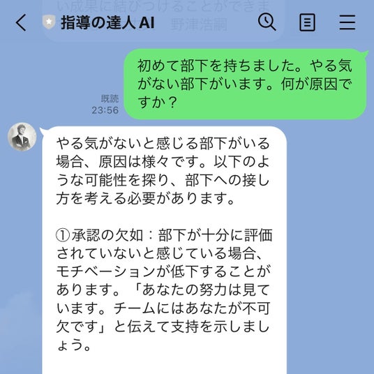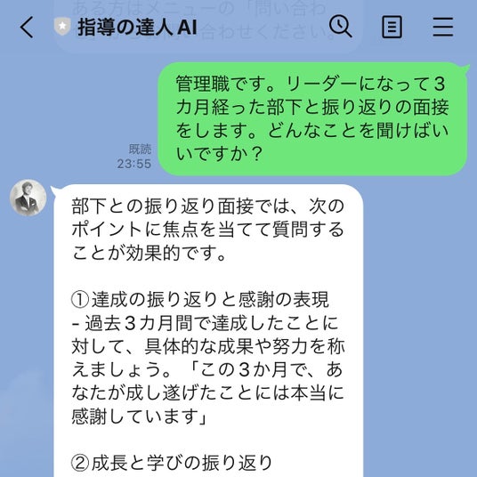 本サービスは、アニメートエンタープライズ社代表取締役 野津浩嗣氏の執筆した書籍や研修プログラム基づいて、経営層から一般従業員まで、あらゆる指導に関する悩みを、LINEで気軽に相談すると、AIが回答し研修内容をフォローするというAI搭載のLINE公式アカウントに対応したチャットボットを提供しております。
