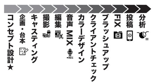 https://www.nac-mob.jp/doratsuku/)のコンセプトは広告の規制や、視聴者の広告に対する嫌悪感を払拭できる”アタラシイ広告”を作り出すことです。広告主が伝えたいことを自然に盛り込み(プロダクトプレイスメント)視聴者の感情に共感し、忠誠度の高いファンを獲得できます。そのため集客・販売・採用といった目的に効果的です。TikTok、YouTube Shorts、Instagramなどを中心に、クライアントと共にショートドラマのコンセプト設計から企画・台本の作成、撮影、編集、分析まで、各プラットフォームに適したアプローチを行います。