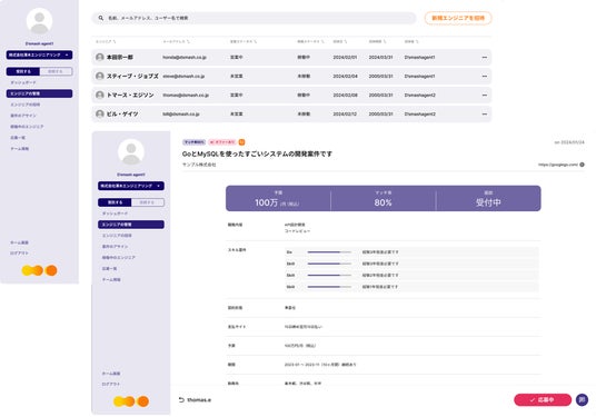 提案及び採用プロセスを全面的にサポートD'SMASHは、マッチングした企業同士が効率的にコミュニケーションを取ることができるチャット機能を提供します。その他、プロジェクトを掲載する企業は気に入ったエンジニアが所属する企業に直接オファーを送ることができます。また、SES企業も自分たちの興味に合致するプロジェクトに対して直接応募することが可能です。