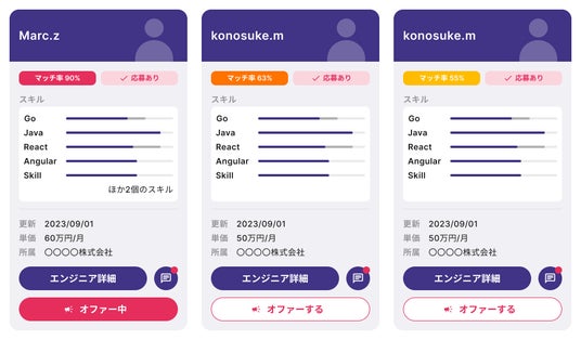 AIでエンジニアとプロジェクトの最適なマッチングを提案D'SMASHは、エンジニアのスキルセットや職歴、プロジェクトが要求するスキルと条件を分析し、マッチ率を算出。マッチ率の高いエンジニアやプロジェクトを優先的に提案することで、選定プロセスの時間と労力を大幅に削減します。