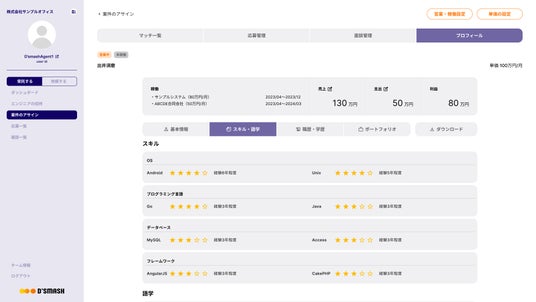 エンジニアのスキル管理と成長支援D'SMASHは、エンジニアのスキルセットと職歴をデータベース化し、企業が社内の技術力を正確に把握できるようにします。このシステムにより、効果的なスキルアップ計画の策定が可能となり、個々のエンジニアの成長を支援します。さらに、データベースから直接、スキルシートや経歴書を生成し、提案時に迅速に提出することができます。