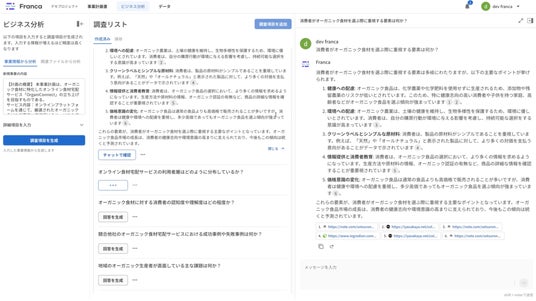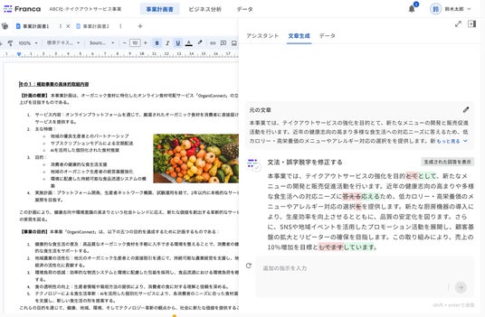 Francaは、Googleドキュメント・Googleスプレッドシートと連携し、市場分析や計数計画、事業計画書ライティングのリアルタイム共同編集が可能です。