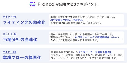 Francaは、新規事業や事業拡大における事業計画書の作成プロセスを、生成AIで効率化するDXサービスです。数多くの補助金獲得を支援してきた補助金支援の専門チームがプロダクト設計を監修し、補助金支援機関の業務効率化をサポートします。